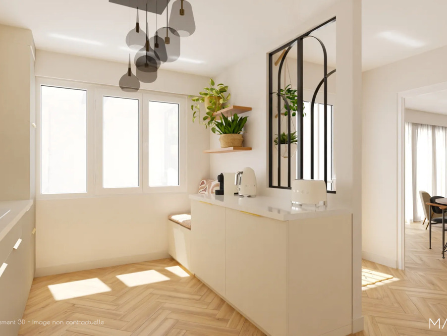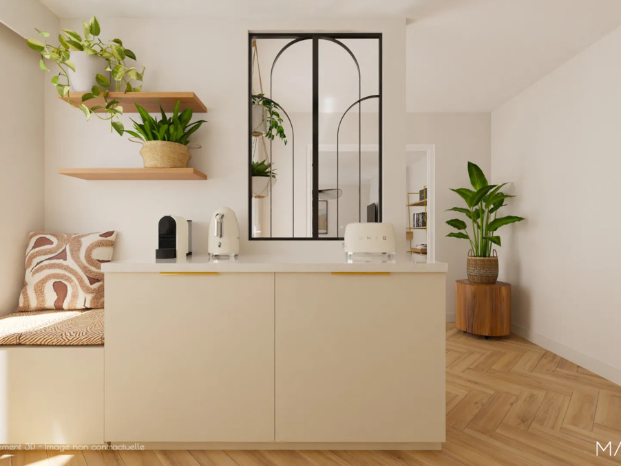 Besoin d'idées pour vous projeter ? MaoDesign vous présente une suggestion d'aménagement pour ouvrir en partie la cuisine sur le salon/séjour.